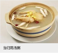 【组成】当归10克,川芎3克,黄芪5克,红花2克,鸡汤1000克,粳米100克。