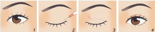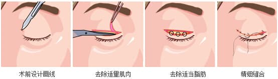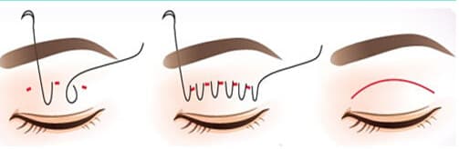 韩式双眼皮般是在上眼皮上做3个仅有1-2mm的不连续的微小创口,去除少量脂肪和眼轮匝肌后,将缝线分别穿过3个创口打活结,等调整好睑缘弧度后再依次缝合打结。