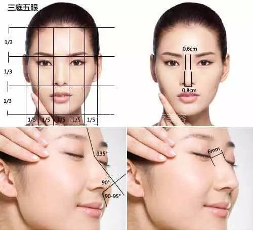 从鼻子的生理美学角度出发的,要对称、角度适合、鼻梁的高度和宽度比例适当,再从鼻子与整个面部,乃至整个身材,以及个人的气质、职业习惯等等联系起来,可以推导出鼻子的和谐曲线,这是个感性的判断,需要对人体美学和面部美学、心理美学等有精深的把握。这是种考虑鼻体结构的几何美感,兼顾鼻体与人体面部及气质等和谐共存,并产生浑然天成的自然美感的处理方式。鼻子长度的2/3是鼻子的高度。另方面,鼻子与颜面的角度,男性是36度,女性是34度。鼻翼的宽度大约在两内眦的垂直线之间,鼻骨的宽度要小于两内眦的距离。